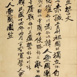 선서문(尹奉吉義士 遺品-宣誓文)은 윤의사가 남긴 유품들 가운데 하나로 김구선생의 한인애국단에 입단하는 것을 직접 손으로 쓴 선서문이다. 내용은 다음과 같다. "나는 적성(赤誠)으로써 조국(祖國)의 독립(獨立)과 자유를 회복하기 위하야 한인애국단의 일원(一員)이 되야 중국을 침략(侵略)하는 적의 장교를 도륙(屠戮) 하기로 맹서(盟誓)하나이다. 대한민국 14년 4월 26일 선서인 윤봉길 한인애국단앞" |